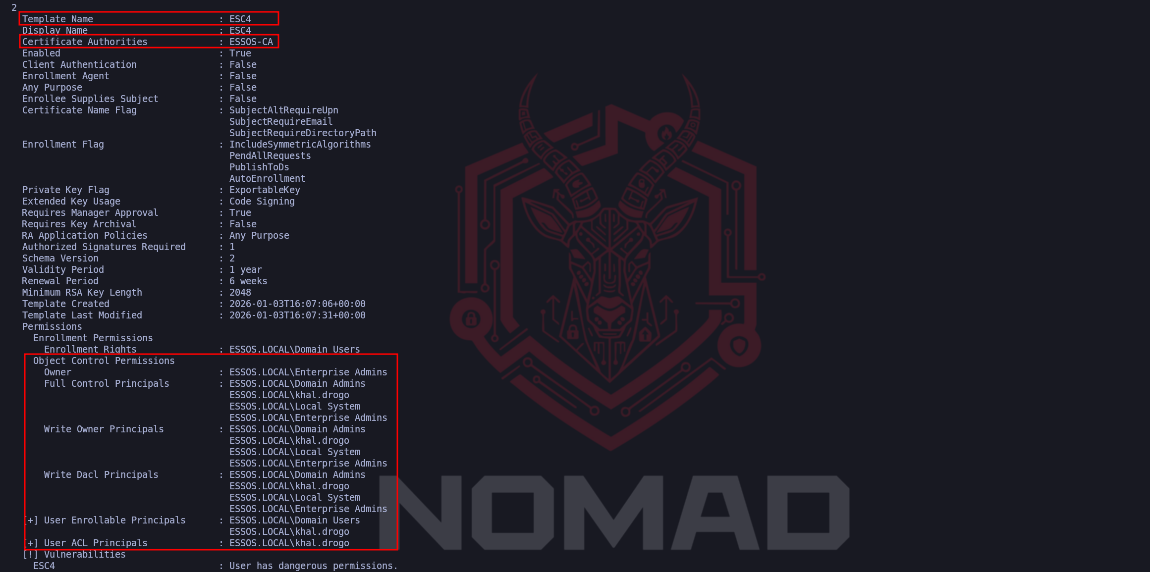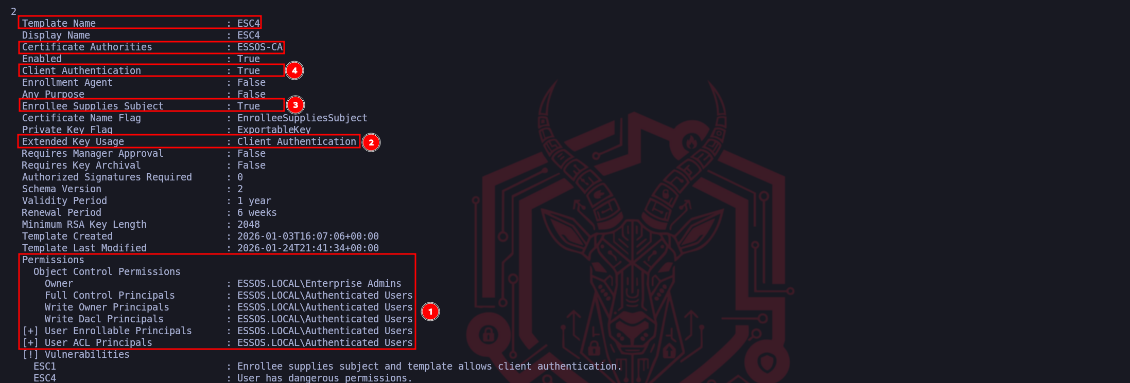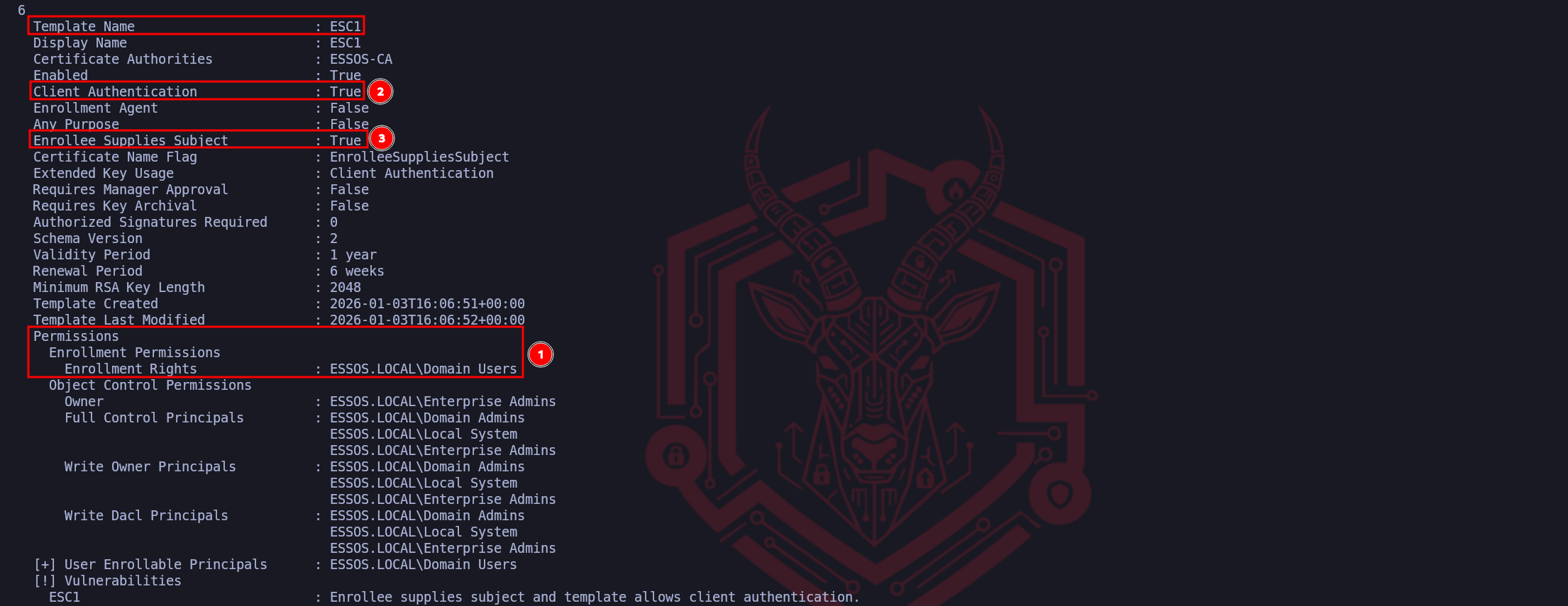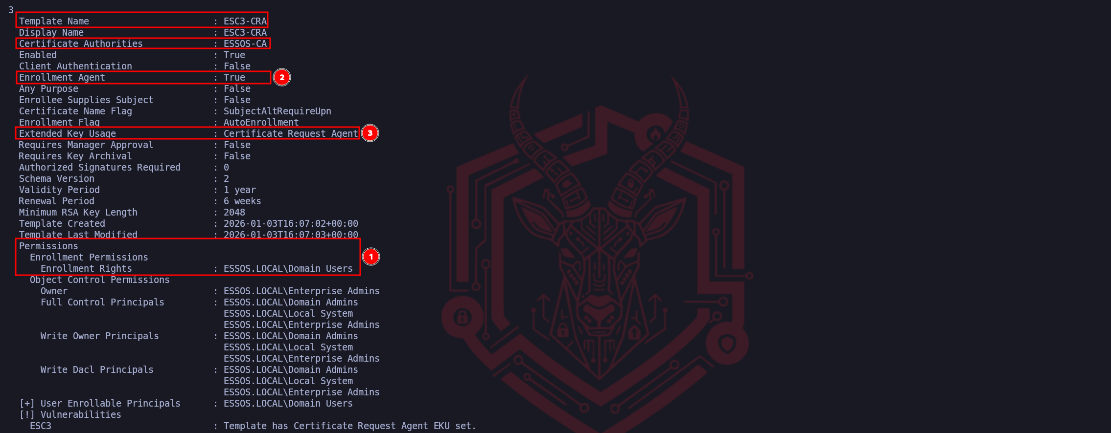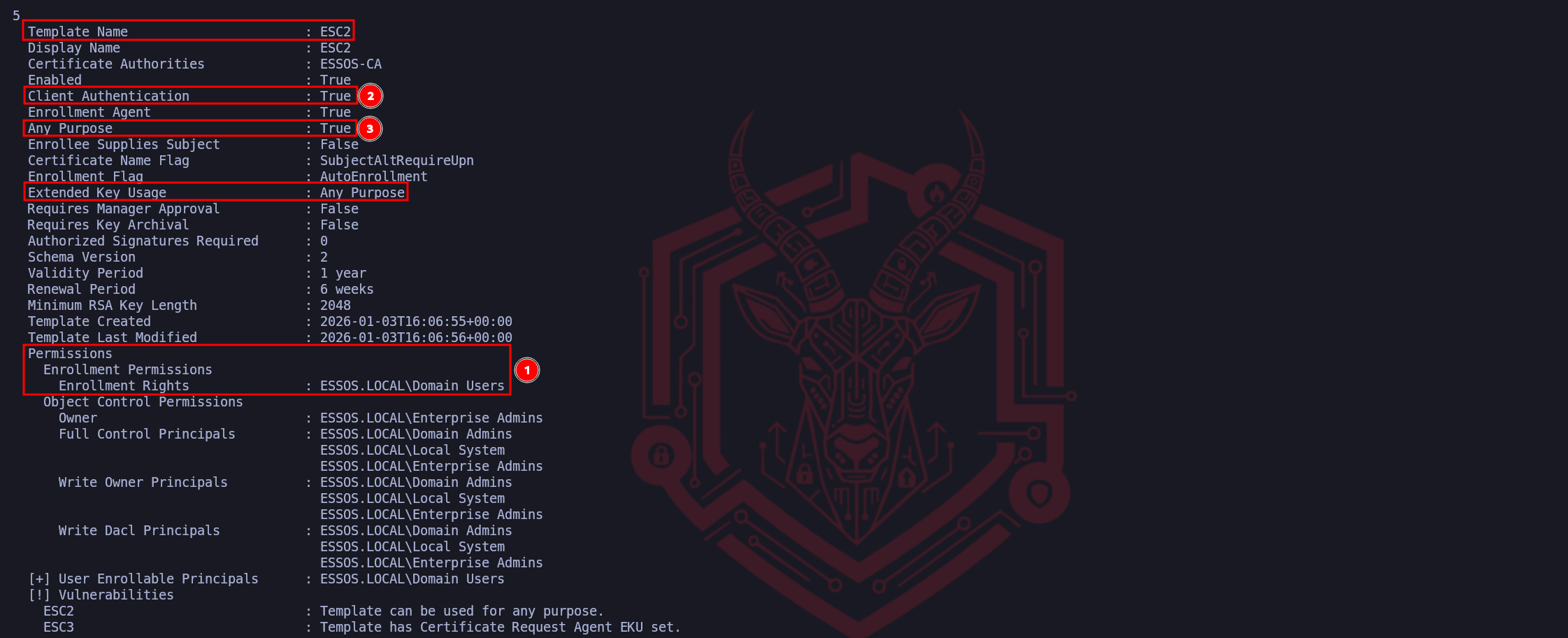 Our ordering follows a logical "Attack Path" mindset, access first, capability second.Marker (1) represents the Access Control verification. Identifying that ESSOS.LOCAL\Domain Users possesses "Enrollment Rights" is the gateway check. It confirms that the vulnerability is accessible to our current low-privileged foothold (