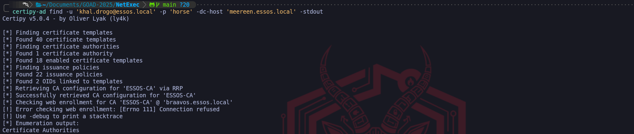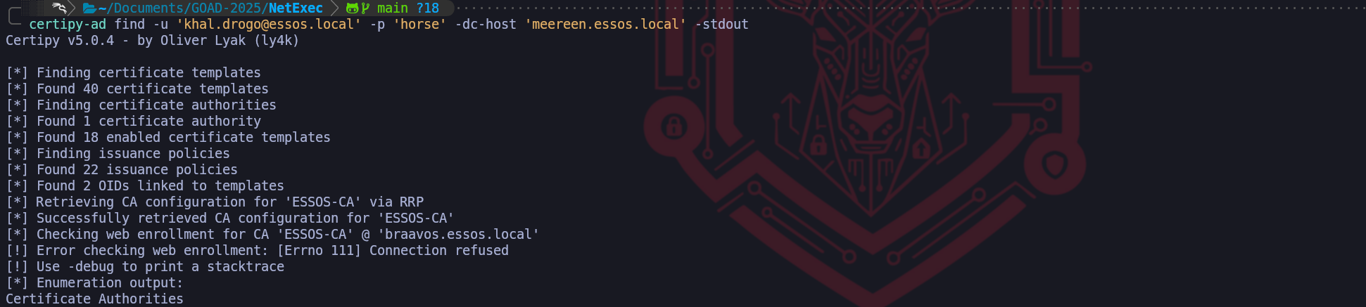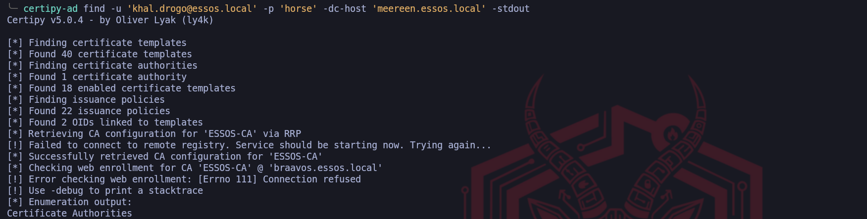 sudo certipy find -u khal.drogo@essos.local -p 'horse' -vulnerable -dc-ip 10.4.10.12 -stdout