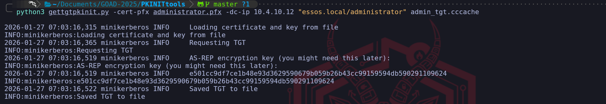 administrator.pfx, represents the complete compromise of the domain identity layer. This file contains both the public certificate signed by the CA and the private key associated with it. In the eyes of the Active Directory authentication service, holding this PFX file is functionally equivalent to knowing the cleartext password of the Administrator account. We have moved from a low-privileged position to possessing a valid, non-revoked digital identity for the highest-privileged account in the Essos domain. Our next move is simply to present this identity to the Key Distribution Center to finalize the takeover.We have now reached the final execution step of the ESC1 kill chain, where we monetize the forged asset we just created. Holding the