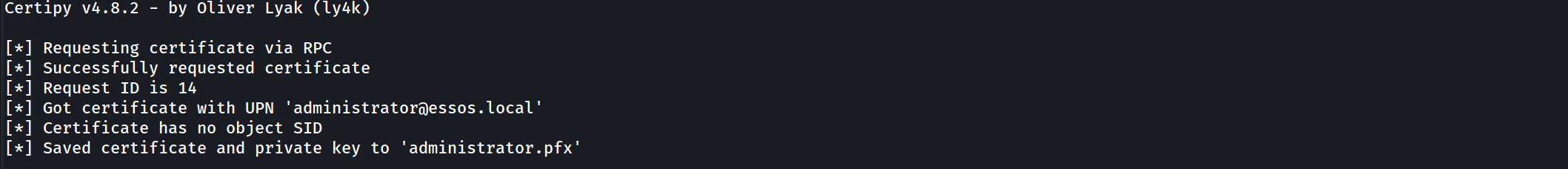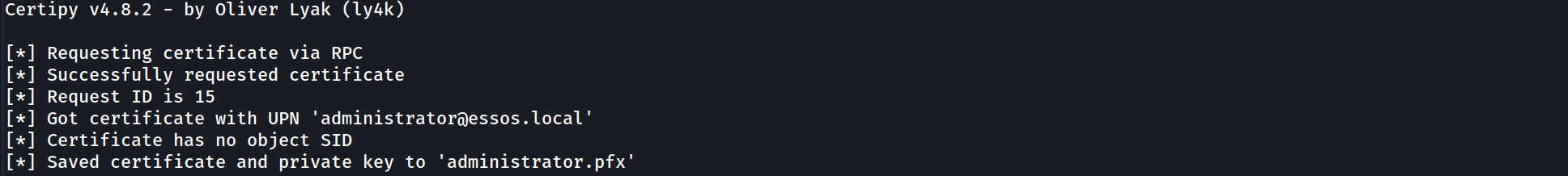 -upn administrator@essos.local. This argument injected a Subject Alternative Name (SAN) into the request that claimed the identity of the Domain Administrator. Due to the misconfigured template logic, the Certificate Authority did not validate this claim against the active directory user account of the requestor; instead, it blindly trusted the input we provided and digitally signed a certificate attesting that the holder of this key is, in fact, the Administrator.The resulting output,