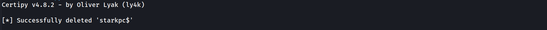 sudo certipy account delete -u administrator@essos.local -hashes 'aad3b435b51404eeaad3b435b51404ee:54296a48cd30259cc88095373cec24da' -user 'starkpc’