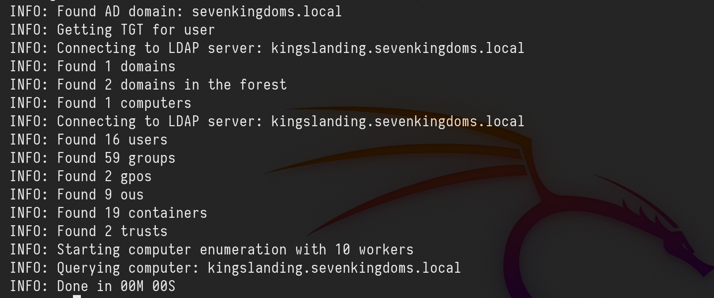bloodhound-python -c all -u 'tywin.lannister@sevenkingdoms.local' -p 'powerkingftw135' -ns 10.4.10.10 -d sevenkingdoms.local -dc kingslanding.sevenkingdoms.local