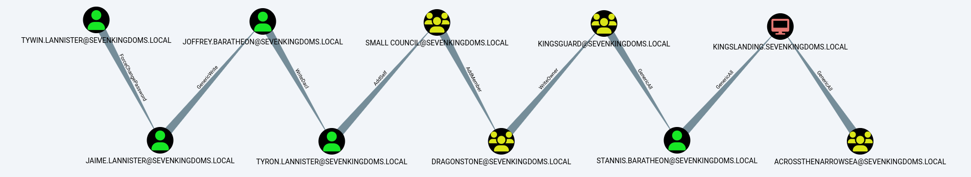 This is exactly what we will do here, we will abuse the GenericAll that KingsGuard Group has over user Stannis.Baratheon, since user Tyron.Lannister is already part of KingsGuard, Tyron.Lannister has Full Control on Stannis.Baratheon.