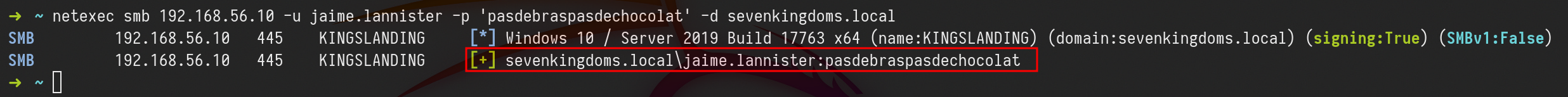 netexec smb 10.4.10.10 -u jaime.lannister -p 'pasdebraspasdechocolat' -d sevenkingdoms.local