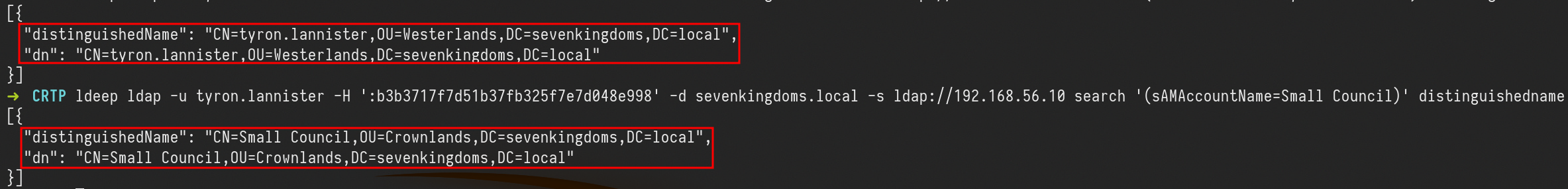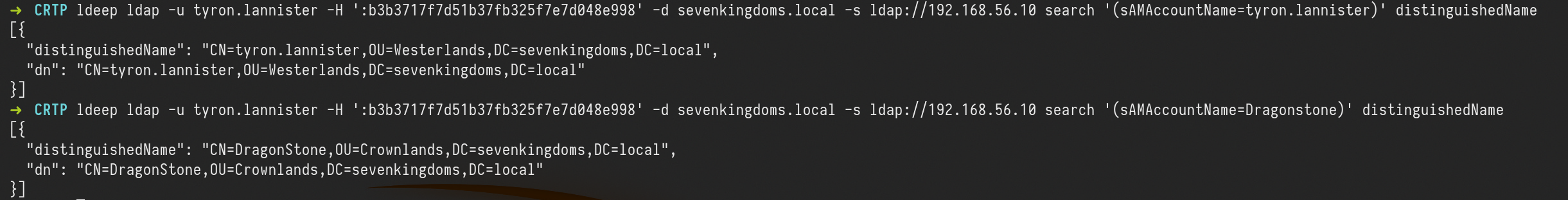 Let’s start by checking tyron.lannister and the DragonStone DistinguishedName.ldeep ldap -u tyron.lannister -H ':b3b3717f7d51b37fb325f7e7d048e998' -d sevenkingdoms.local -s ldap://10.4.10.10 search '(sAMAccountName=tyron.lannister)' distinguishedName