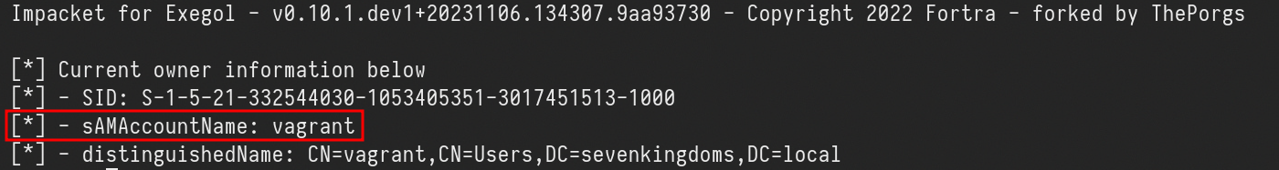 owneredit.py -action 'read' -target 'kingsguard' sevenkingdoms.local/tyron.lannister -hashes ':b3b3717f7d51b37fb325f7e7d048e998'