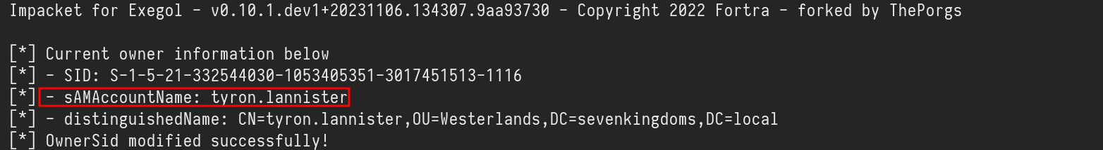 owneredit.py -action 'write' -new-owner 'tyron.lannister' -target 'kingsguard' 'sevenkingdoms.local/tyron.lannister' -hashes ':b3b3717f7d51b37fb325f7e7d048e998'