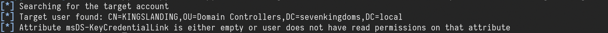 “Attribute msDS-KeyCredentialLink is either empty or user does not have read permissions on that attribute”, this information doesn’t mean that we do not have the right permission on to read kingslanding$ attribution, because we enumerated already that we do have GenericAll right on the machine. So it menas that msDS-KeyCredentialLink is really empty.