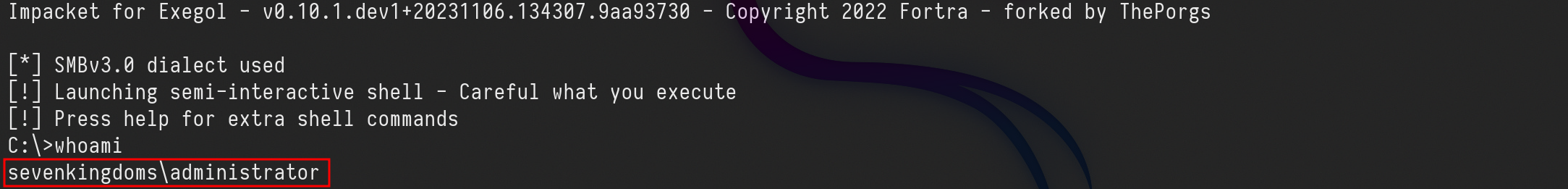 From this point, we know that KINGSLANDING$ is the Domain Controller of sevenkingdoms.local domain, we can do several things here like a DCSync attack straightforward.