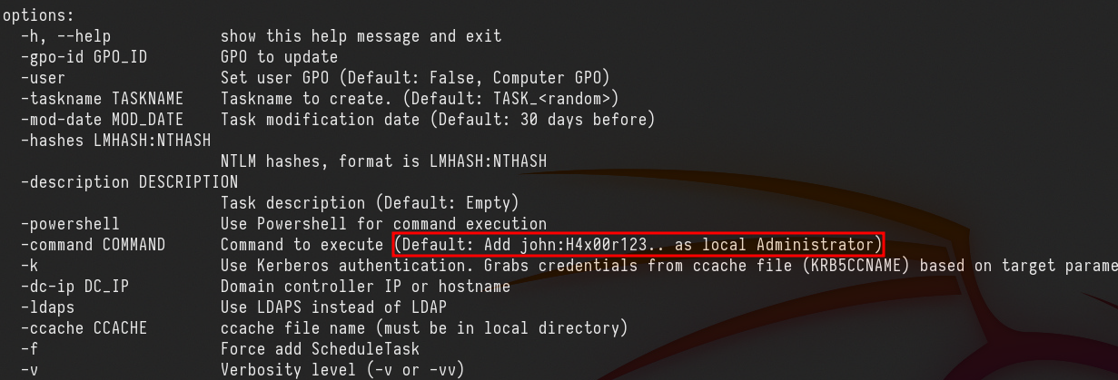 If we check pygpoabuse.py, you will notice that the default command is to add user John with the password H4x00r123.. and the user will also be added to the local Administrator group.